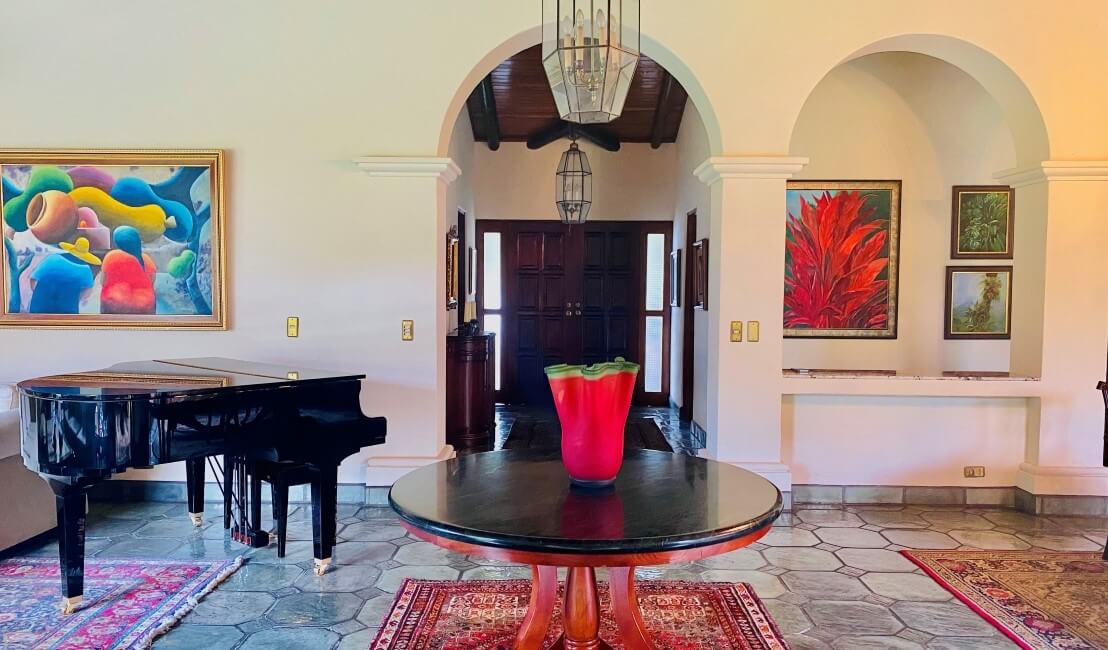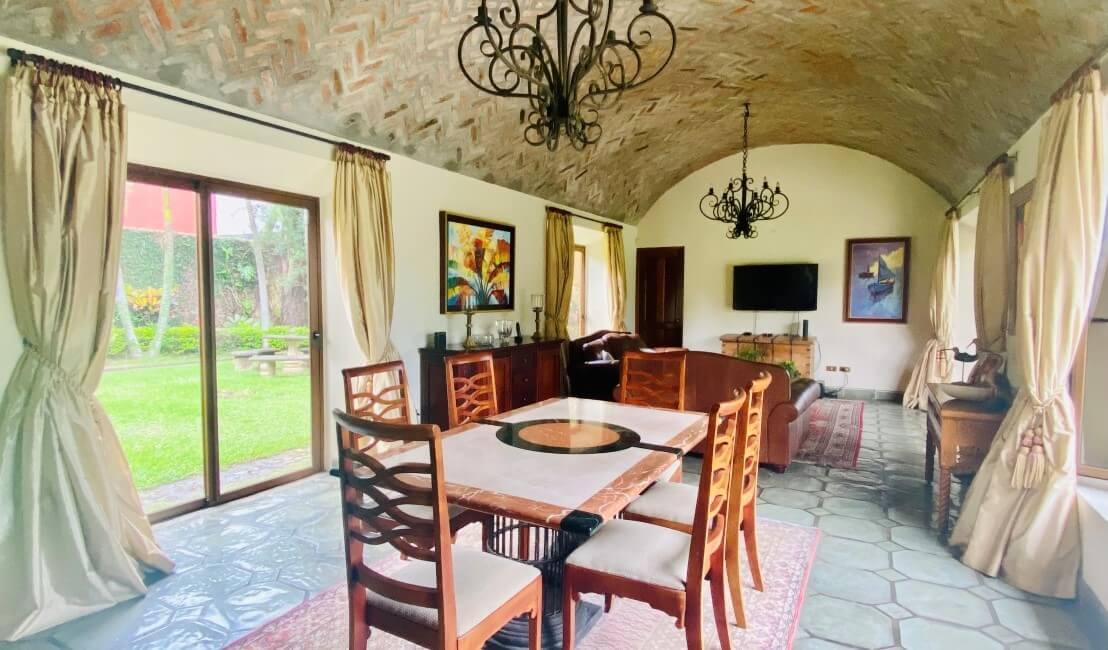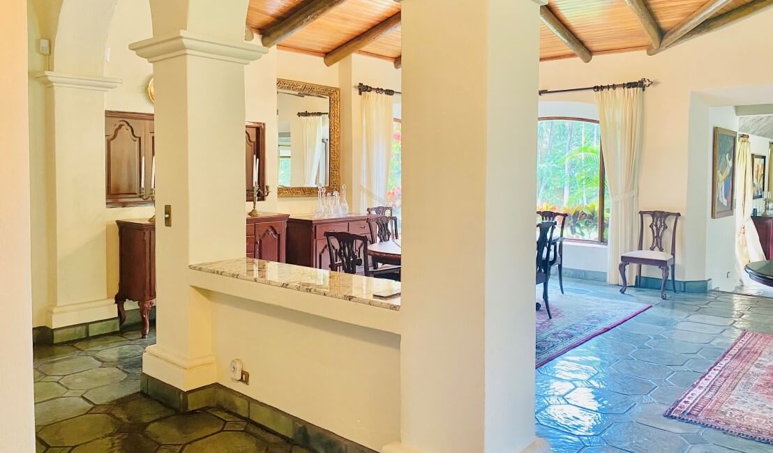 Un solo nivel constructivo para mayor comodidad y accesibilidad, recubierto en pisos de porcelanato y cielos que destacan por sus bellas maderas con troncos de Teca y madera conocida como Gavilán. La sala y comedor, en un mismo espacio amplio y abierto, lleno de iluminación natural, este espacio nos dirige a una segunda ubicación en donde destacan los cielos en ladrillo importados de Nicaragua, especialmente para lograr un diseño único y un ambiente acogedor para el disfrute de una segunda sala formal y comedor, que, al abrir en su totalidad las puertas de vidrio, permite ingresar la fresca brisa y el disfrute visual de las amplias zonas verdes. La cocina posee muebles en madera con sobres de granito, cuenta con ventanas que permiten apreciar la vista a los jardines